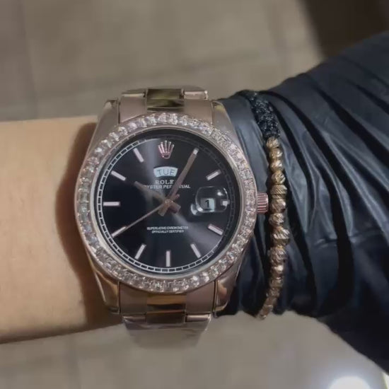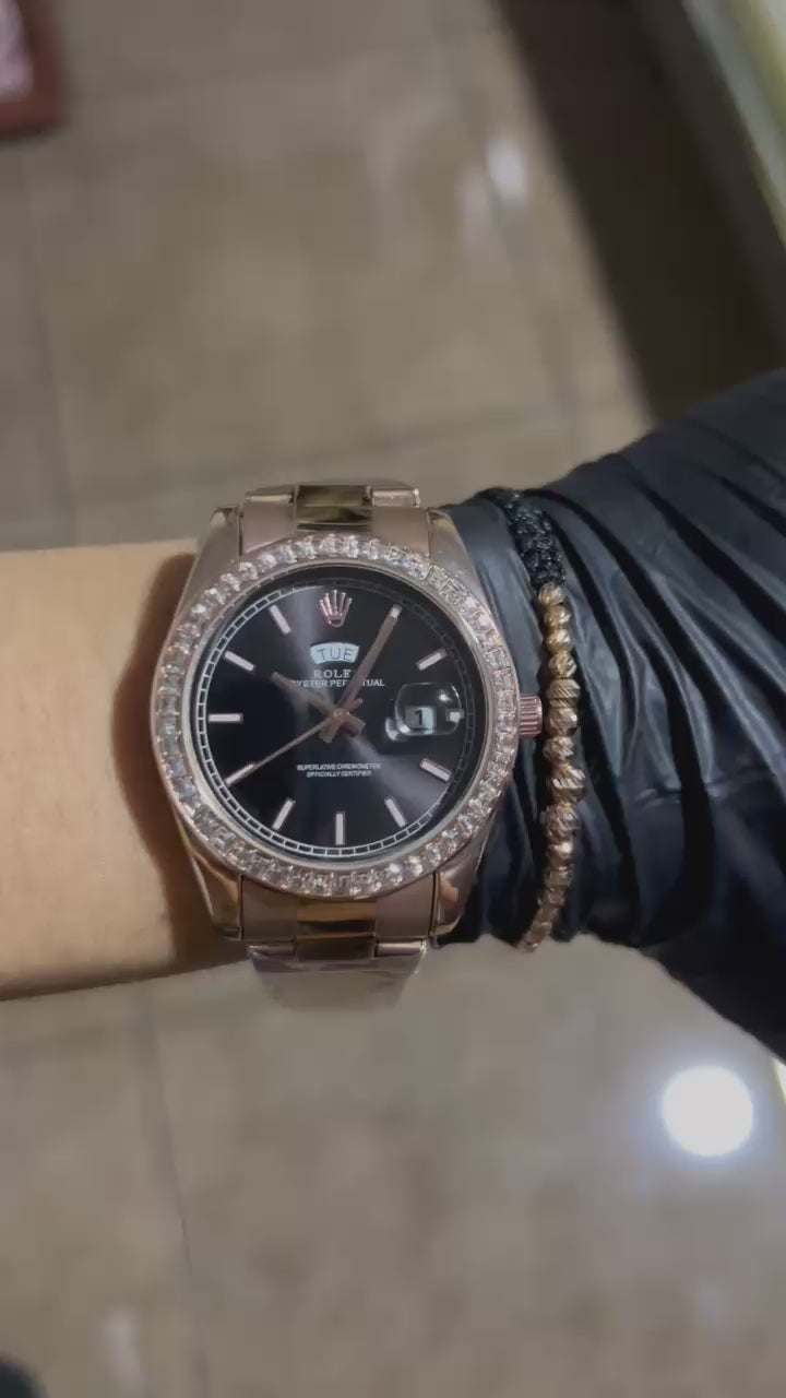 El reloj Rolex en oro rosa con circones es una pieza de lujo que exuda elegancia y sofisticación. La cálida tonalidad del oro rosa se complementa perfectamente con los brillantes circones, creando un contraste deslumbrante que aporta un toque de glamour sin perder la distinción. Su diseño clásico y refinado está acompañado de la precisión y fiabilidad que caracterizan a Rolex, convirtiéndolo no solo en una joya visual, sino también en un accesorio funcional y duradero. Ideal para quienes buscan lujo, exclusividad y un toque de brillo en su estilo.
